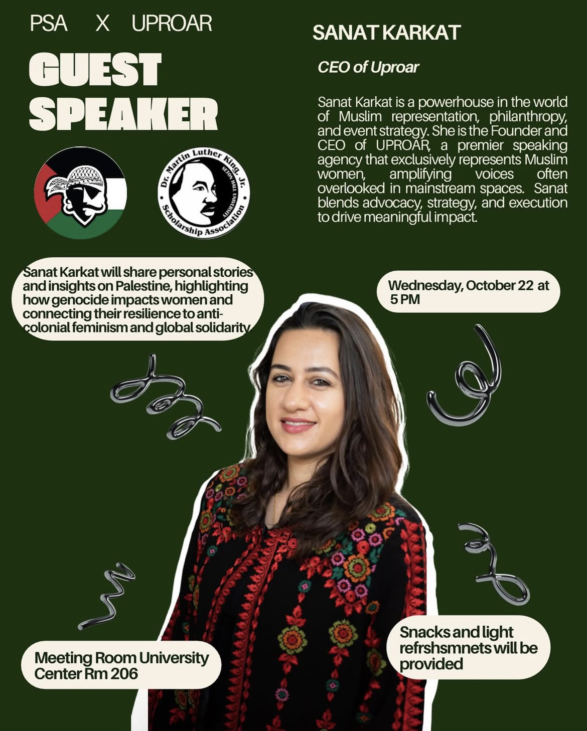 Sanat Karkat is a powerhouse in the world of Muslim representation, philanthropy, and event strategy. She is the Founder and CEO of UPROAR, a speaking agency that exclusively represents Muslim women. With a Master’s degree in Conflict Resolution from King’s College London and a certification in Fundraising Management from the Lilly School of Philanthropy at Indiana University, Sanat blends advocacy, strategy, and execution to drive meaningful impact.